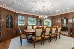Dining Room: Elegant and inviting, with plaster ceiling moulding, carved marble fireplace, and leaded glass windows bathing the space in natural light.
