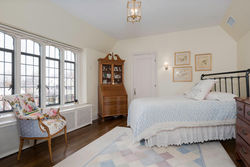 The gracious master bedroom with fireplace leads to a second dressing room with original built in mirrored closet doors.